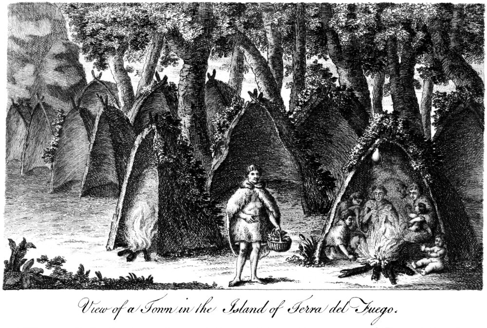 The ships soon came to an anchor in the bay which had been discovered, proposing to take in wood and water. While they remained here, several of the natives made a fire opposite the ship; on which signals were made for them to come on board; but as they would not, the Commodore went on shore, and gave them some trifles, which pleased them highly; he likewise divided some biscuit among them, and was surprized to remark, that if a bit of it fell to the ground, not one of them would stoop to take it up without his permission: some of the sailors being at this time cutting grass for a few sheep which the Commodore had on board, the Indians instantly ran to their assistance, and tearing up the grass in large quantities, soon filled the boat. On Mr. Byron’s return, they followed in their canoe till they came near the ship, at which they gazed with the most profound astonishment. Four of them were at length prevailed on to go on board; and the Commodore, with a view to their diversion, directed one of the midshipmen to play on the violin, while some of the seamen danced; the poor Indians were extravagantly delighted; and one of them, to testify his gratitude, took his canoe, and fetching some red paint, rubbed it all over the face of the musician; nor could the Commodore, but with the utmost difficulty, 29escape the like compliment. When they had been diverted for some hours, it was hinted to them, that they should go on shore which they at length did, tho’ with evident reluctance.