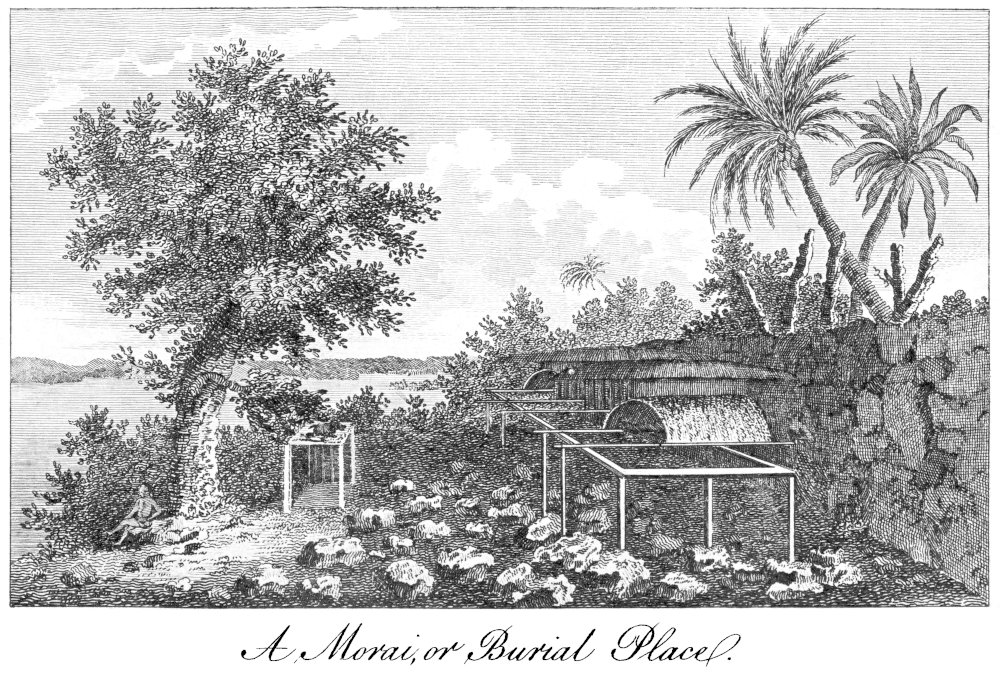 The burial-places of the natives were under high trees, near their houses; and their tombs consisted of flat stones, laid on perpendicular side stones, like those in the church-yards of England. On the branches which shaded these repositories hung baskets of reeds, containing the heads and bones of turtle and other fish, and near the graves were several boxes filled with human bones.