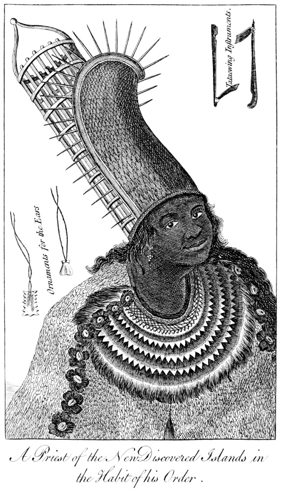 On Wednesday, June the 12th, they sailed to another island, and as they coasted along it, the natives, armed as those of the other islands, kept even with the ship for some leagues. They frequently plunged into the sea, or fell on the sand, that the surf might break over them, to cool and refresh themselves. The boats being near the shore, the crew made signs that they were in want of water; on which the natives pointed farther along the shore, where, when the boats arrived, they saw a number of houses, and whither they were followed by the Indians, many more of whom joined them at this place. The boats having got close in shore, and the ships laying at a small distance, a venerable old man, with a white beard, advanced from the houses to the beach, attended by a young fellow. Having made a signal for the other Indians to retire, he came forward to the edge of the water, pressing his beard to his breast with one hand, and holding a branch of a tree in the other. He now made a kind of musical oration, during which the people in the boat threw him some trifling presents, which he would neither take up, nor permit his attendant to touch till he had finished his harangue, when he walked into the water, and throwing the branch to the boat’s crew, he retired, and picked 40up their presents. Most of the natives having complied with a sign made for them to lay down their arms, one of the Midshipmen swam ashore; on which they flocked round him, admiring his cloaths; as his waistcoat pleased them most he gave it to them, which he had no sooner done, than one of them untied his cravat and ran away with it. He now thought it time to retreat to the boat, whither several of the natives swam after him; some bringing each a cocoa-nut, and others fresh water in the nut-shell. The boat’s crew had taken with them some shells of the pearl oyster, in order to learn of the natives how to procure some pearls; but they could not possibly make them comprehend their meaning. This island is situated in 14 degrees 41 minutes south latitude, and 149 degrees 15 minutes west longitude; and both the islands the Commodore called King George’s Islands, in respect to his Sovereign. In a lake belonging to the last island, two or three very large vessels were seen, one of which had two masts, with proper cordage.