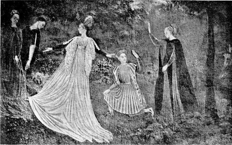 Upon the aqueous shore the Four Seasons wait with their twelve attendant lunar nymphs to cast about their “Venus calva” the emerald and topaz girdle of virginity, and the ruby and sapphire mantle of royalty. A merrily dancing chorus of seven times fifty-and-two dainty fairies of the day, hand-in-hand, are ready to escort their Queen through the amber grotto to her royal throne beneath the myrtle-grove.