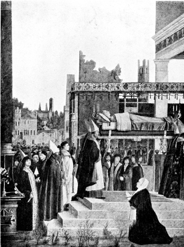 Bodies—more or less entire—were exhumed, purchased, or stolen, from scenes of fierce martyrdom, or from quiet resting places, and reverently conveyed in Venetian galleys to the Lido for distribution among the churches of the Lagunes. Each translation was an exhibition of manly abasement and womanly devotion: Doge and Dogaressa, no less than the poorest of the poor, took part in the ecstatic ceremonies.