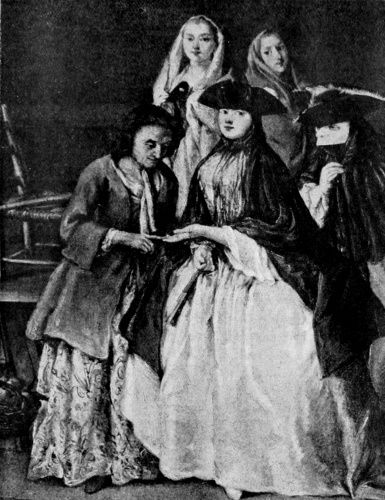 Women of every age and clime care very little about the Fine Arts, so called, they are themselves the finest of the Fine Arts, and their sympathy goes out rather to the artistic Crafts, in search of objects to add, if may be, to their own charms and attractiveness. In Venice the “Fragilie,” or Trade-Guilds, were directly under the patronage of the Dogaressas, and we shall find their personal attributes in the beautiful and fragile glass of Murano, and the delicate and chaste point-lace of Burano, in the lovely and costly ornaments of the goldsmiths, in the superb brocades of silk and velvet and the splendid tissues of gold and silver of the costumiers, and in the endless fascinating adjuncts of the toilet and the table.