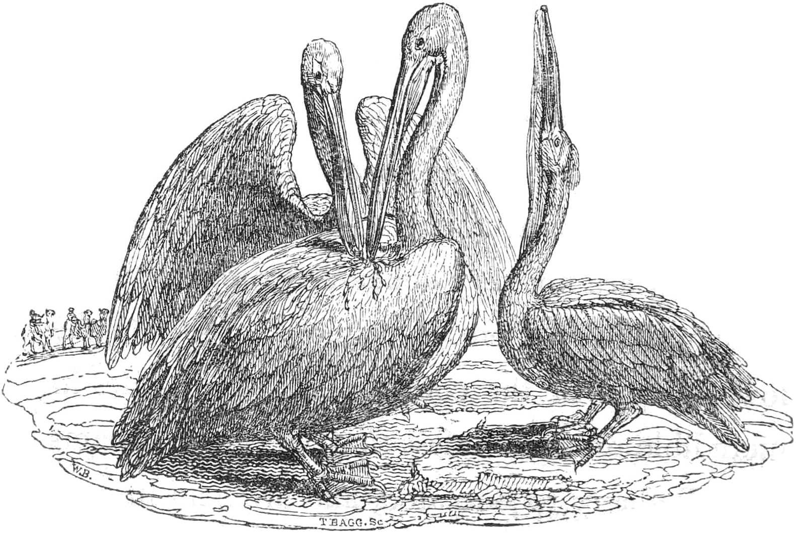 Of the feathered tribe, there are various species, of rich and brilliant plumage. Parrots, Guinea fowls in a wild state, and a variety of doves, are seen in the branches of the beautiful trees, and by their chattering and cooing, impart a grateful animation to the spot near which they may happen to take up their abode. The golden pigeon is sometimes to be seen; its ground colour is a rich and vivid blue, and the feathers on the breast and under the wings are[15] tinged with a glittering yellow, whence it takes its name. The grey pelican abounds on the margins of rivers and streams in Houssa; it is much less than the white pelican, and the beak in particular is considerably smaller than that of the latter species. The former are found in immense numbers, more especially at a place called Zulamee, and build their nests close to the water’s edge, near to which they always stand to feed their young. The eggs are esteemed as a delicacy by the natives; but the flesh of the bird is of so offensive a flavour that it cannot be eaten. It is somewhat singular that the opinion of the pelican feeding its young with its blood is as general in Houssa as it is amongst the lower class of people in Europe; and to this belief I must acknowledge myself a proselyte! I have stood for a long while together by the side of this stupid animal, watching its motions, and seeing it bending its head for its offspring to extract their nourishment. The young ones thrust their beaks into a small round aperture at the lower part of the back of the neck of their parent, and they swallow the substance[16] that flows freely through. If it be not blood that issues from the old bird, it is a red liquid so closely resembling it, that the difference cannot be perceived. I took a sketch of a pelican feeding its young in this manner, in Houssa, which is now in my possession; and I should not have said so much on the subject, if my assertions had not been questioned by several of my countrymen.