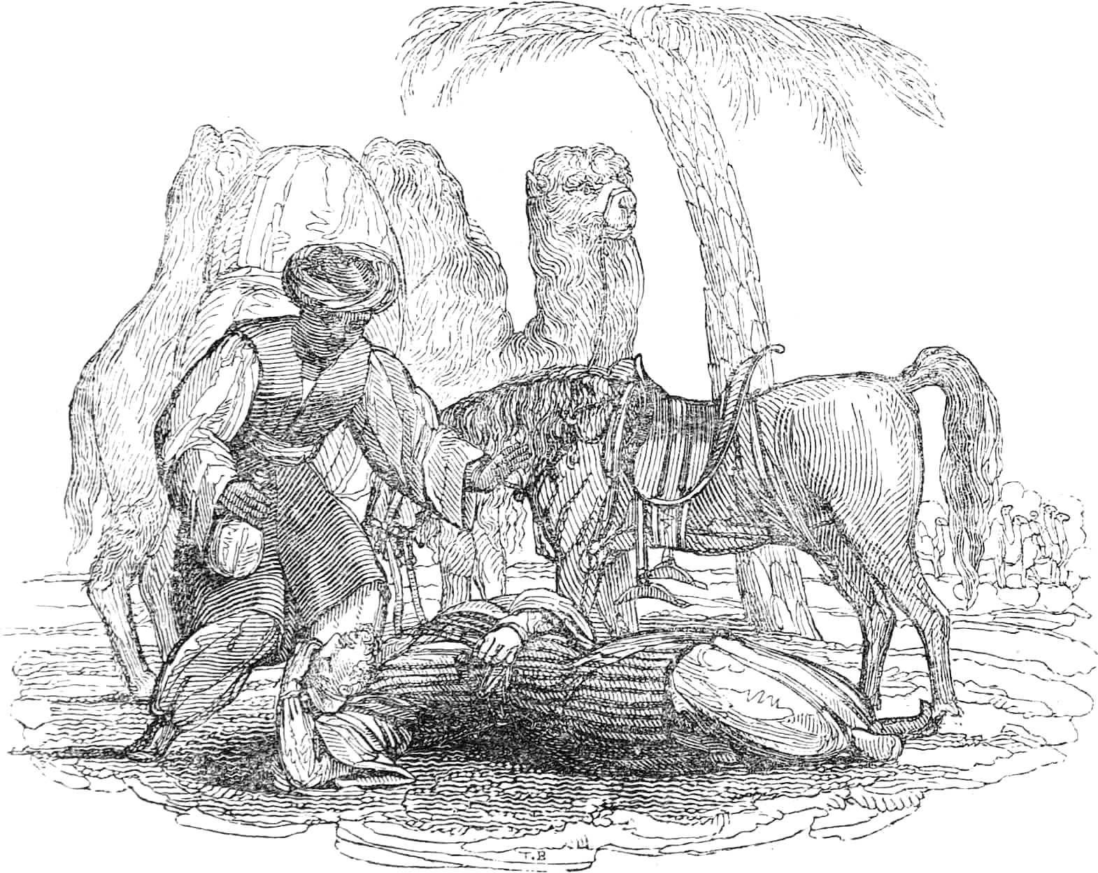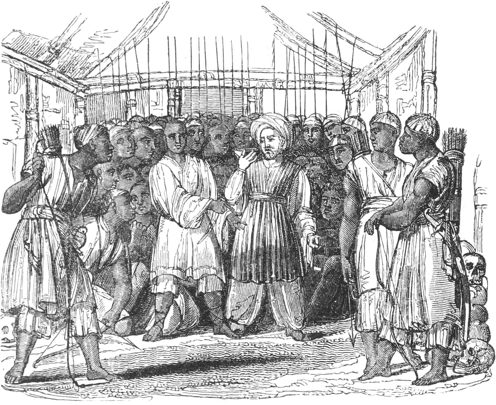 The war between the Bornouese and Falatahs, which has been already mentioned as raging at the time of our arrival in Kano, and which had caused the Arabs in that city great uneasiness, originated from the following cause:—A famine[39] having impoverished the natives of the former country, and threatened them with utter destruction, the Sheikh sent a number of handsome horses, for which his kingdom is celebrated, as presents to the Governor of Kano, and the chiefs of other Falatah towns. The animals were delivered to the care of the ambassadors, who depicted to the receivers of them, in lively colours, the destitute condition of the people of Bornou; and intimated a wish that the Falatahs would relieve their wants, by returning as much corn and other provisions as they could readily spare, without putting themselves to an inconvenience. The custom of giving and receiving presents is of very ancient standing in Africa, and sanctioned by universal adoption. Instead of acceding to the reasonable desires of the Ruler of Bornou, the Chiefs of all the towns, excepting the Governor of Kano, kept indeed the horses, but followed the example of many rude nations of antiquity, as well as that of more modern times[1] and sent back the ambassadors to[40] their monarch, with bundles of sharp-pointed spears, hinting by these hieroglyphics, that if the Sheikh wanted corn, he was to come and fight for it. The Governor of Kano, however, went even a step beyond this, for he not only retained the horses sent him, but bound the unsuspecting ambassadors hand and foot, and taking them to the market-place, the pitiless Falatah publicly butchered them in cold blood. The consummation of this atrocious act, to which I was myself a spectator, elicited a universal murmur of disapprobation from the slaves, who form by far the major part of the inhabitants of the city; and it was generally feared, from their deep but not loud execrations, that they would have risen into open revolt, and revenged the murder of the Bornouese, by wreaking their vengeance on the head of the perpetrator of the abominable crime. This effervescence of the public mind, nevertheless,[41] had subsided at the period of my departure for Soccatoo, without producing any of the effects so much dreaded by the free population of Kano; and the recollection of the revolting and sanguinary action of the Governor was swallowed up in other and more important incidents.